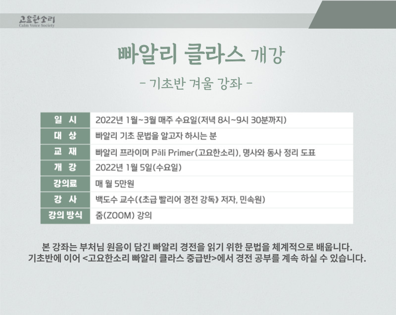 빠알리 클라스 기초반 겨울 강좌 수강생 모집(개강 2022/1/5)