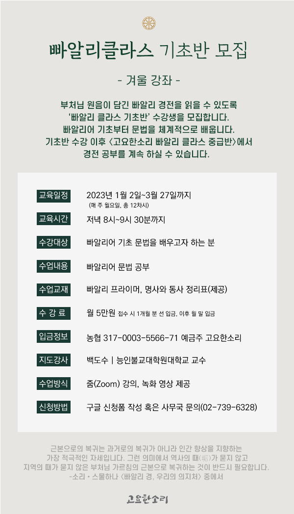 빠알리클라스 기초반 겨울강좌 수강생 모집(~1/1까지) 관리자 2022-12-08 조회수 : 2036 첨부파일: 모집-관련-게시글-웹포스터.jpg >>빠알리 클라스 기초반 신청하기 [클릭]