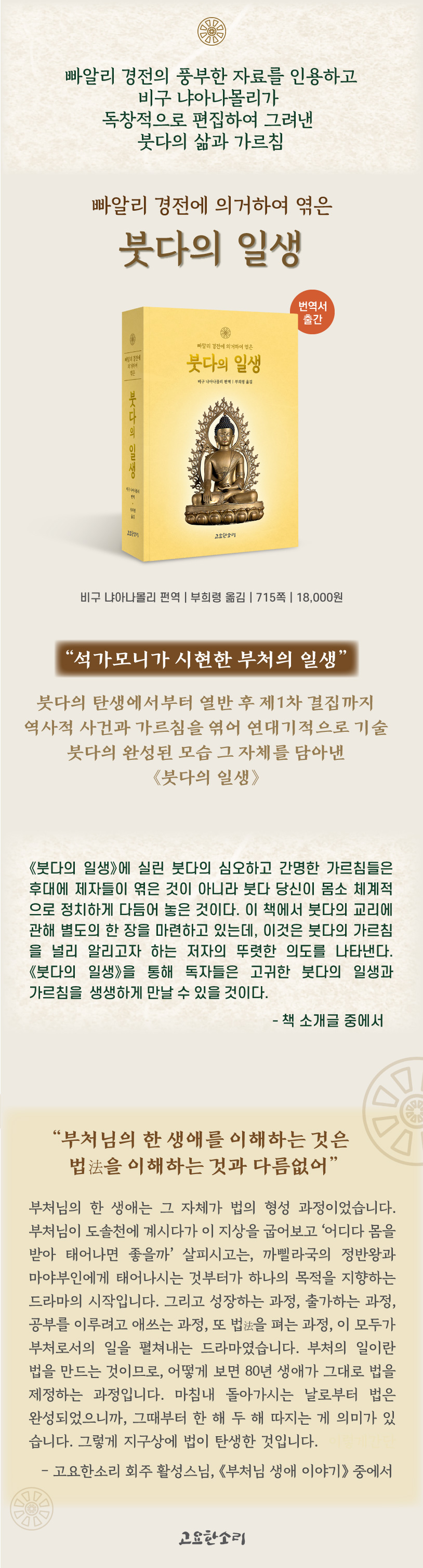 [신간] 빠알리 경전으로 엮은 '붓다의 일생' 출간 관리자 2023-02-24 조회수 : 1843 첨부파일: 붓다의-일생-홍보.jpg ▶책 주문은 고요한소리 홈페이지를 이용해주시거나 각종 온라인 서점(교보문고, 예스24, 알라딘)에서도 구입하실 수 있습니다.^^