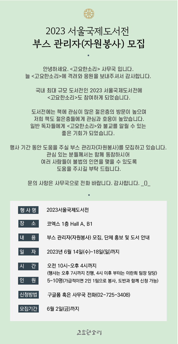 2023서울국제도서전 부스 관리자 모집(~6/8까지) 관리자 2023-05-18 조회수 : 1085 첨부파일: 서울국제도서전 봉사자 모집-100.jpg >>부스 관리자 신청하기 [클릭] https://forms.gle/rQuom2XSMJcp66n6A