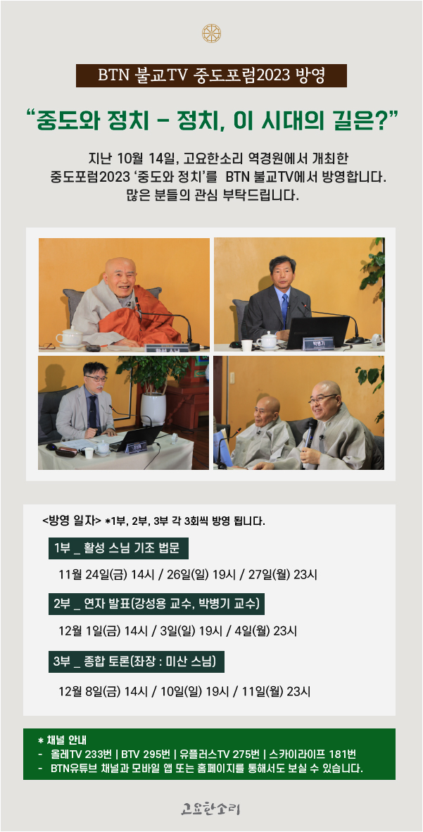 [BTN불교TV] 중도포럼2023 '중도와 정치' 방영 안내