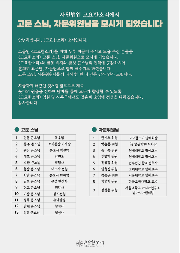 〈고요한소리〉 고문 스님, 자문위원을 모시게 되었습니다.