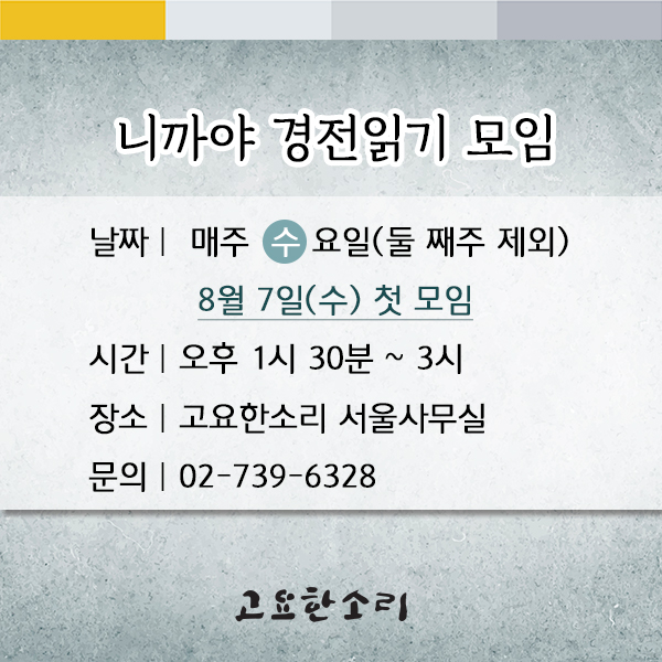 니까야 경전읽기 모임 (매주 수요일) 개설 관리자 2019-07-08 조회수 : 3512 첨부파일: 니까야읽기모임.jpg 매주 수요일 오후 1시 30분(둘째 주 제외), 니까야 경전읽기 모임이 새롭게 시작됩니다.많은 관심과 참여 부탁드리며 주변에 관심있는 분들께 널리 알려주십시오. 감사합니다._()_