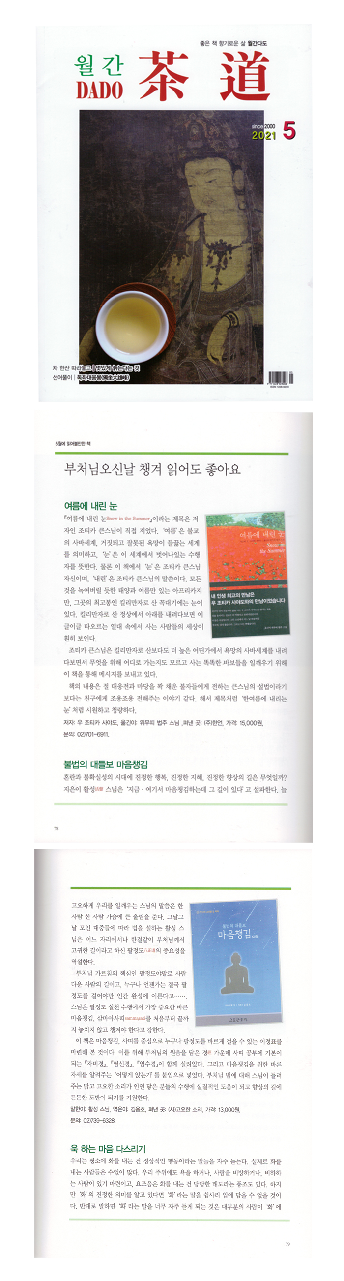 [월간다도茶道] 2021년 5월호 - 부처님오신날 추천 도서 관리자 2021-05-03 조회수 : 6930 첨부파일: 210503_월간다도-5월호.jpg 월간다도 5월호 부처님오신날 추천 도서에《불법의 대들보 마음챙김》이 실렸습니다.