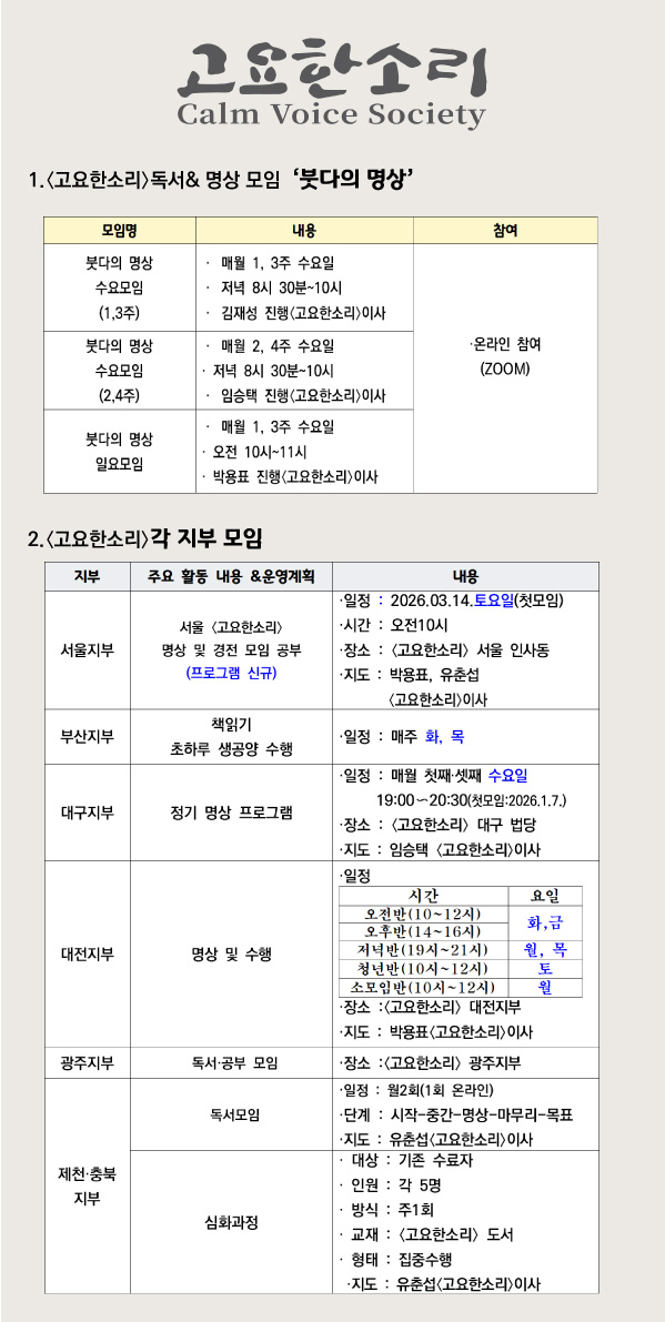 독서 및 명상모임, 고요한소리 책 읽기, 붓다의 경 읽기 등 다양한 모임이 운영되고 있으니