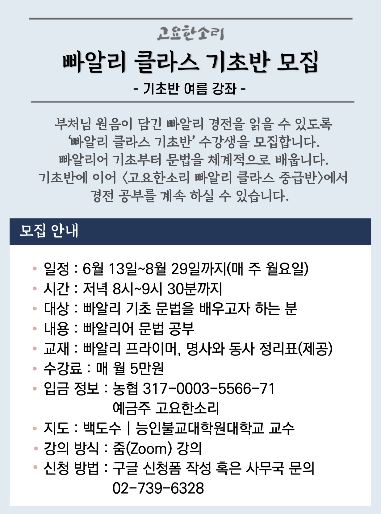 빠알리 클라스 기초반 여름강좌 신청(~6월 13일까지) 관리자 2022-05-26 조회수 : 2206 첨부파일: 기초반 모집.jpg -> 구글폼으로 신청하기 : https://forms.gle/FUppYQzrTFYiH9yb9(클릭)