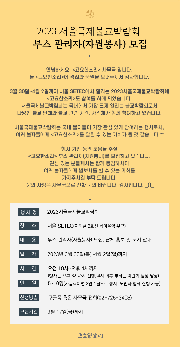 [모집] 2023서울국제불교박람회 부스관리자(~3/17까지) 관리자 2023-03-02 조회수 : 1228 첨부파일: 서울국제불교박람회-모집.jpg ▶ 신청하기[클릭] : https://forms.gle/yuvHTTyAKCZimVR1A
