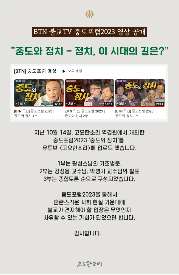'중도포럼2023 중도와 정치' 영상 유튜브 공개 관리자 2023-12-22 조회수 : 983 첨부파일: 중도포럼2023 유튜브 영상.jpg * 1부 [활성 스님 기조법문] 영상 보기(클릭) * 2부 [연자 발표] 영상 보기(클릭) * 3부 [종합토론] 영상 보기(클릭)