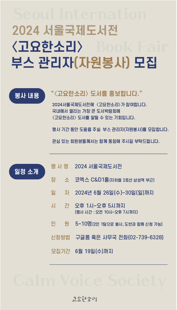 2024 서울국제도서전 부스 관리자(봉사) 모집 관리자 2024-06-04 조회수 : 1116 첨부파일: 2024서울국제도서전 봉사자 모집.png * 2024 서울국제도서전 부스 관리자(봉사) 신청 링크 >> [클릭]