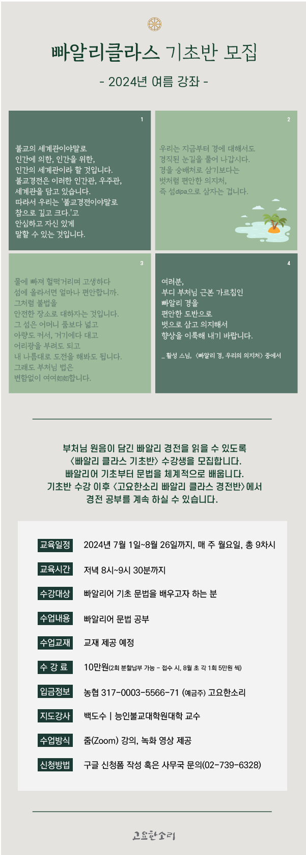 [모집] 빠알리 클라스 기초반 여름강좌 안내(~7/1 모집) 관리자 2024-06-13 조회수 : 1800 첨부파일: 빠알리클라스 기초반(2024년 여름).png * 빠알리 클라스 기초반 여름강좌 신청 >> [클릭]